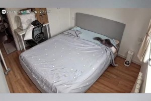 监控下的猫咪,猫咪早上偷偷起来为女子整理床