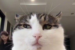 女子介绍自家的猫,猫摆出一副老谋深算的表情