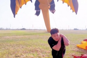 潍坊风筝节惊现巨型喷火龙风筝,男子被拽得直咧嘴,场面超硬核!