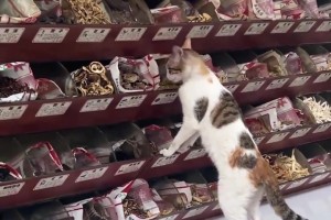 路人经过一家潮汕中药铺,老板在抓药,顾客在买药,猫咪在吃药